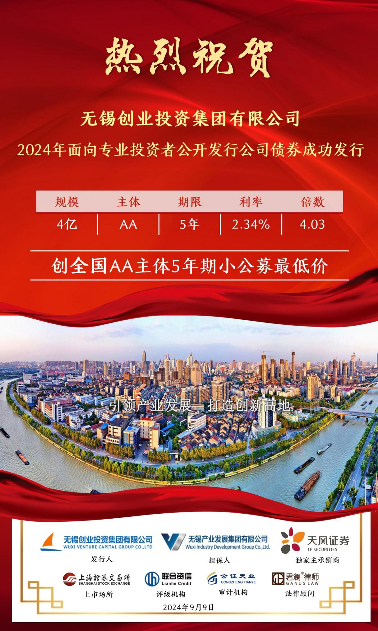 9月9日,無錫創(chuàng)業(yè)投資集團(tuán)有限公司(簡稱“無錫創(chuàng)投集團(tuán)”)2024年面向?qū)I(yè)投資者公開發(fā)行公司債券“24錫創(chuàng)01”成功發(fā)行,發(fā)行規(guī)模4億元,發(fā)行期限5年,認(rèn)購倍數(shù)4.03倍,票面利率2.34%,創(chuàng)全國可比債券歷史發(fā)行最低利率!本期債券由天風(fēng)證券承銷,主體評級AA,債項(xiàng)評級AAA。 無錫創(chuàng)投集團(tuán)作為無錫產(chǎn)業(yè)集團(tuán)旗下的創(chuàng)業(yè)投資和股權(quán)投資平臺,近年來在集團(tuán)的正確領(lǐng)導(dǎo)和大力支持下,圍繞無錫“465”現(xiàn)代化產(chǎn)業(yè)集群建設(shè),聚焦產(chǎn)業(yè)集團(tuán)“1+4+X”產(chǎn)業(yè)布局,持續(xù)深化產(chǎn)融協(xié)同合作,不斷提升資金使用效率,努力為公司高質(zhì)量發(fā)展提供更低成本、更長周期、更加靈活的資金支持。未來,公司將繼續(xù)承擔(dān)國企社會責(zé)任,勇挑重?fù)?dān),發(fā)揮自身優(yōu)勢,持續(xù)為無錫新質(zhì)生產(chǎn)力和實(shí)體經(jīng)濟(jì)高質(zhì)量發(fā)展注入新活力、增添新動能。 |